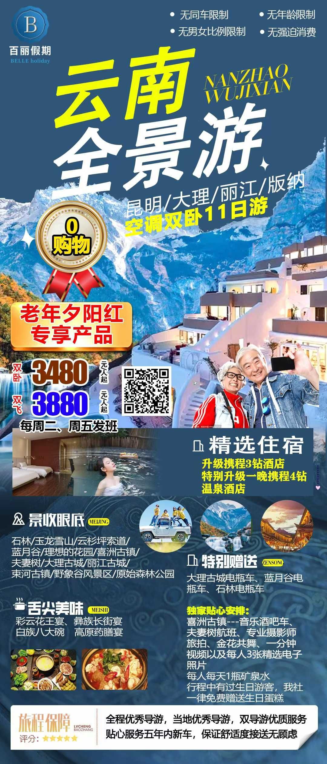 云南全景夕阳红双卧11日游